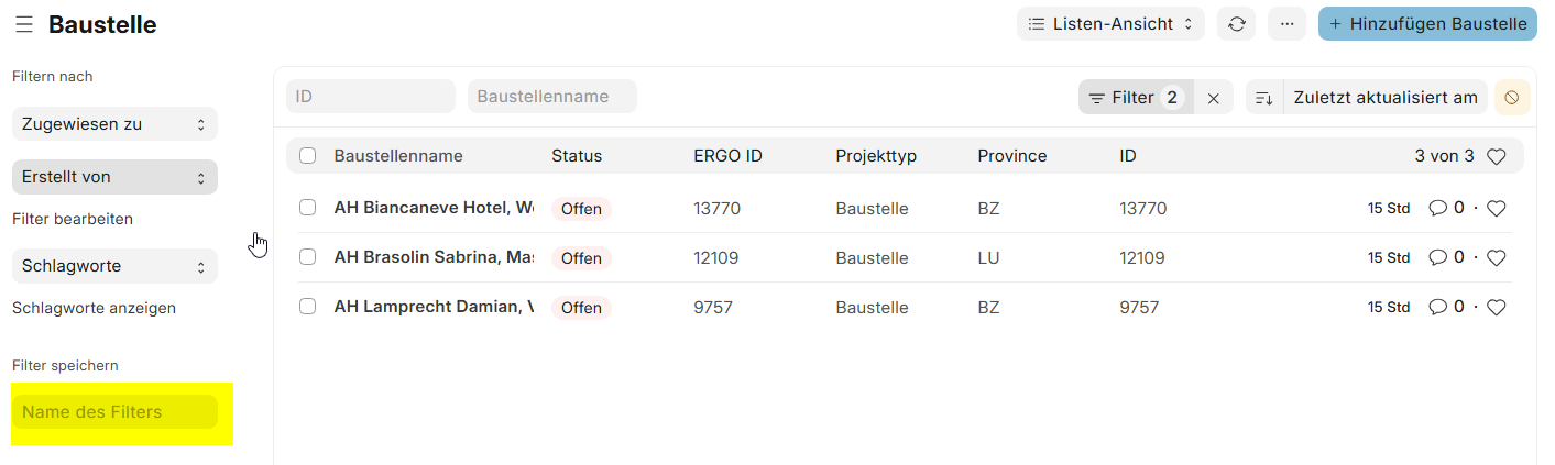 Hier kannst du deinem Filter einen Namen geben (z. B. Meine offenen Baustellen).