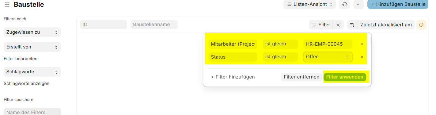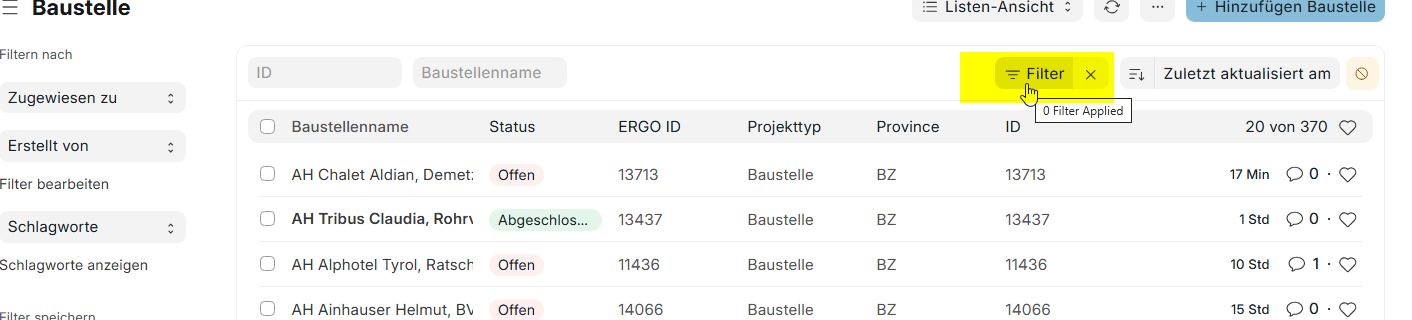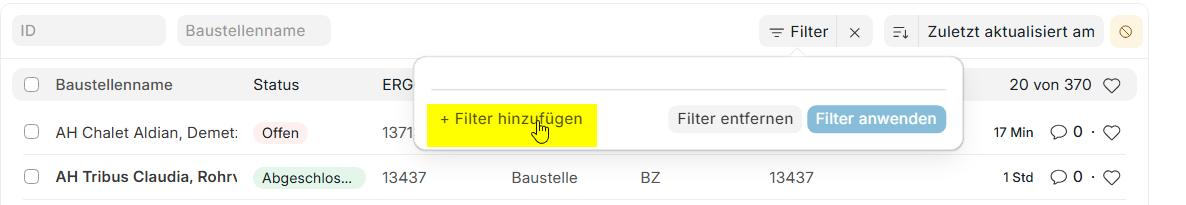Öffne die Filterfunktion in der Baustellenübersicht.