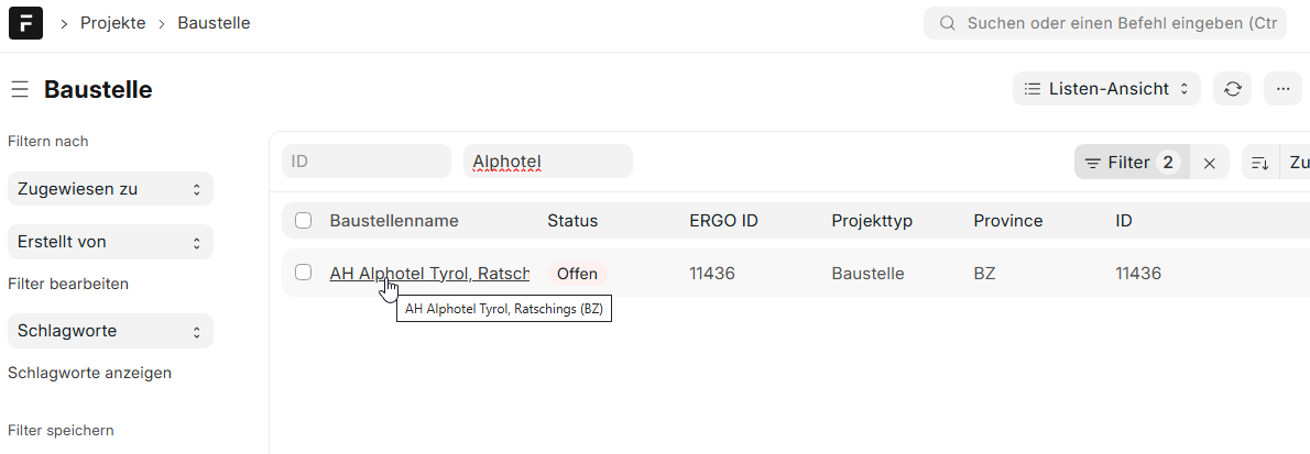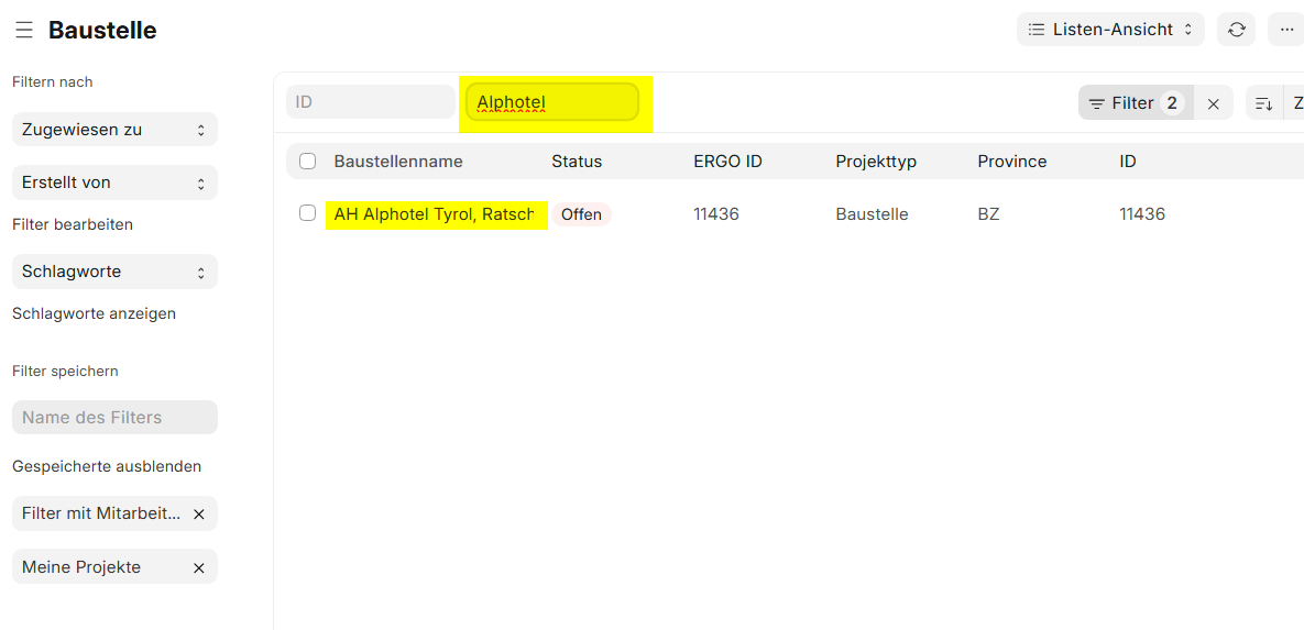 Gib hier den Namen der gewünschten Baustelle ein – z. B. „Alphotel Tyrol“