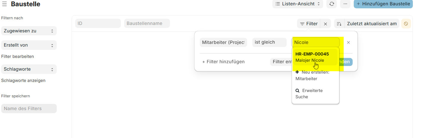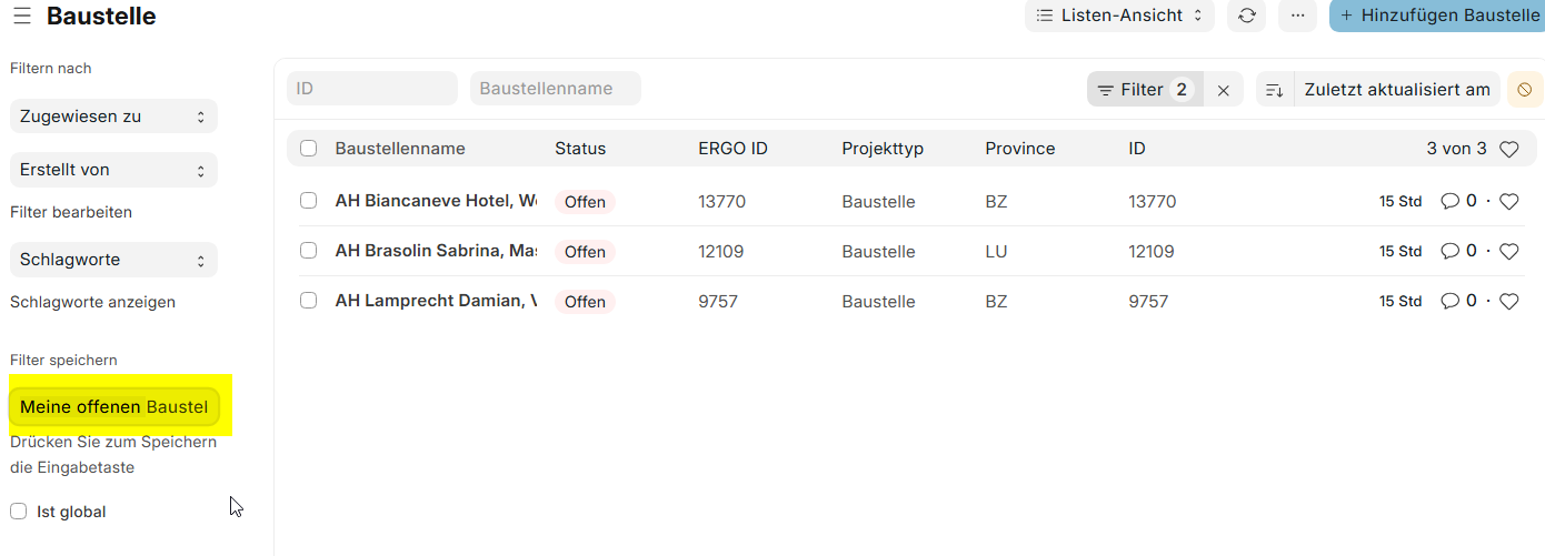 Um nur die Baustellen anzuzeigen, bei denen man selbst als Projektkontakt eingetragen ist und die aktuell noch offen sind, kann ein individueller Filter gespeichert werden.