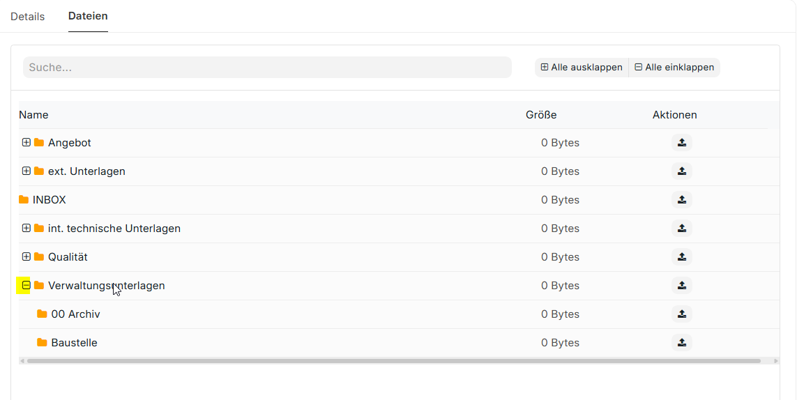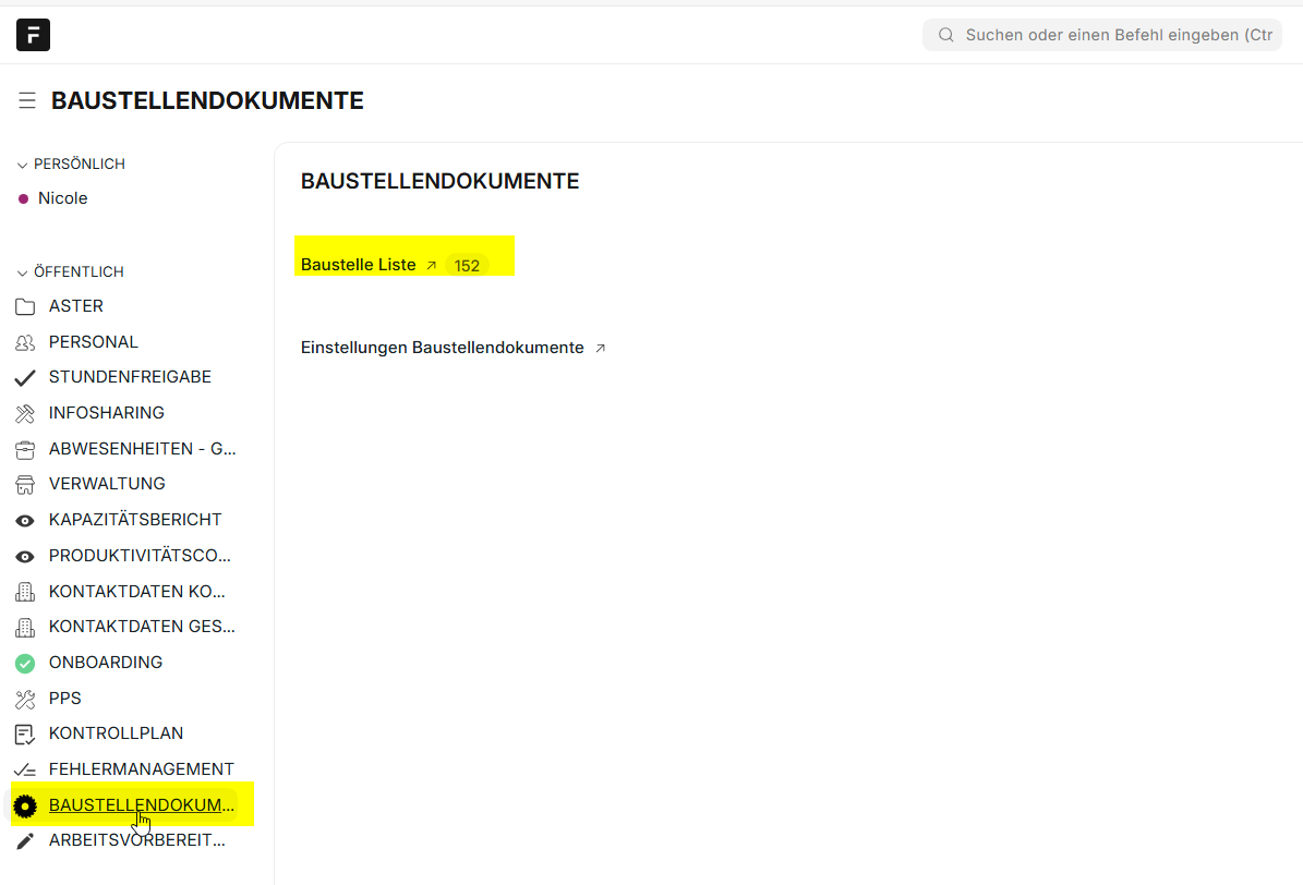 Sobald du auf eine Baustelle klickst, öffnet sich automatisch die zugehörige Dokumentenablage.