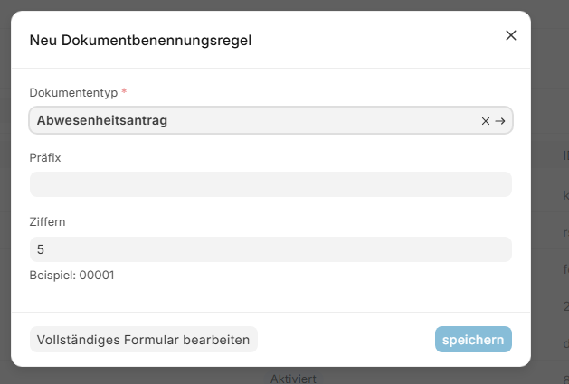 Den Dokumenttyp, für welchen du eine Benennungsregel erstellen möchtest, kannst du hier eingeben. Klicke darauf auf den Button "Vollständiges Formular bearbeiten".