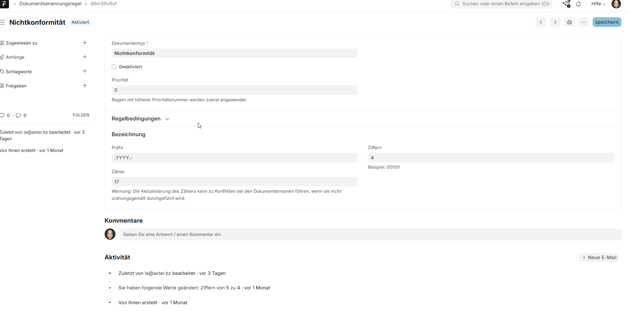 Schreibe in das Suchfeld Dokumentbennungsregel Liste und füge dir zu einem beliebigen Dokumenttypen eine Benennungsregel hinzu.