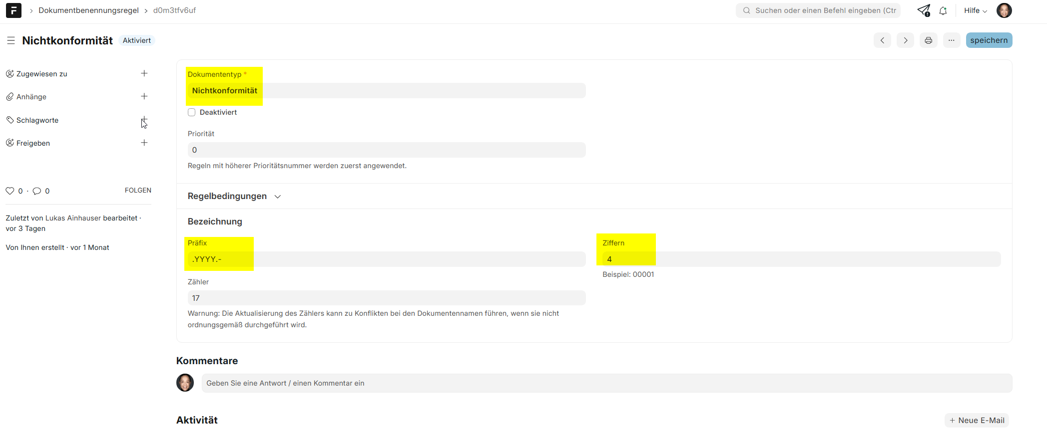 Klicke auf "Hinzufügen Dokumentbenennungsregel". Nun wird dir folgendes Feld angezeigt (Siehe Bild unten):