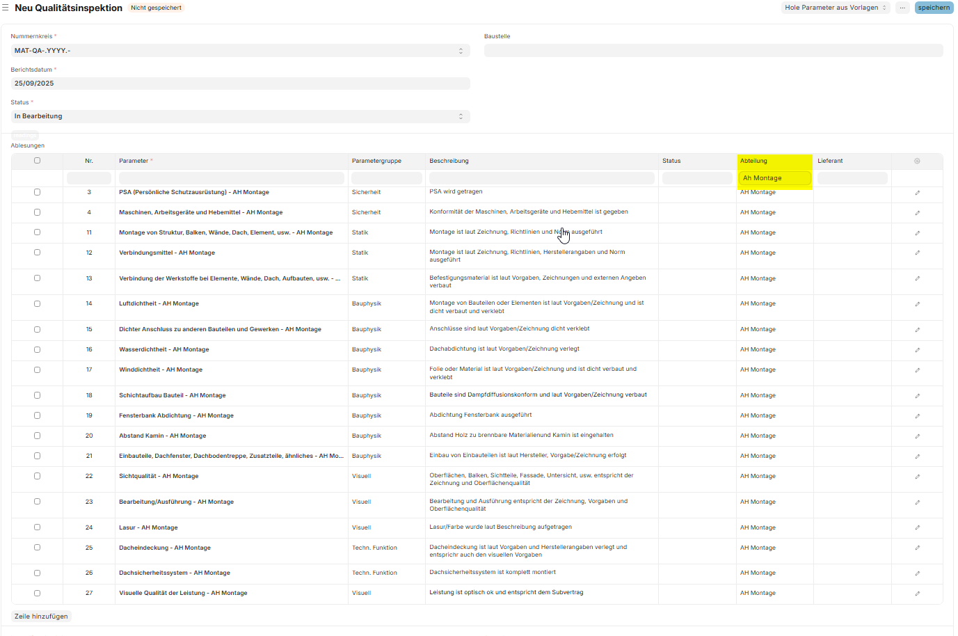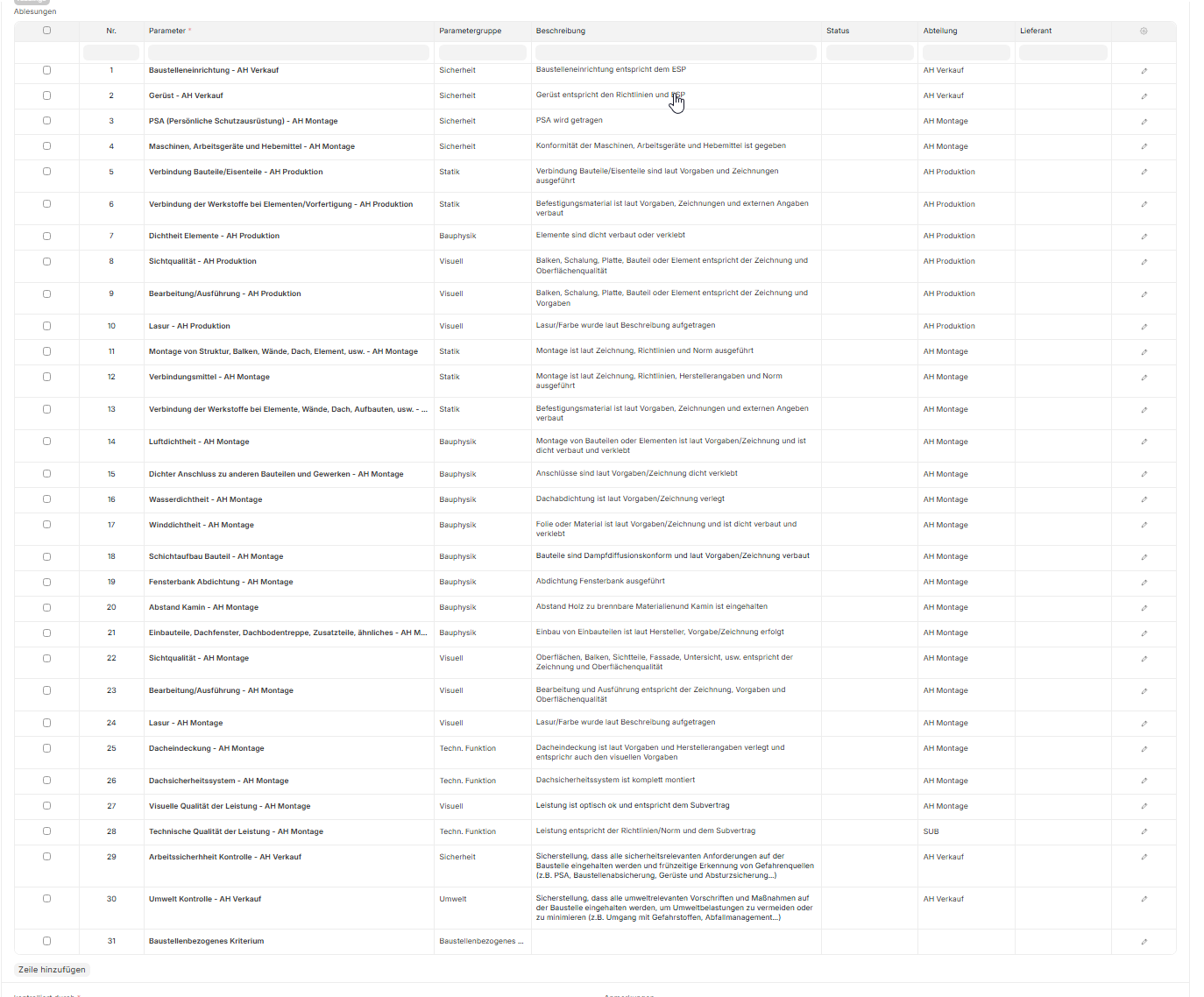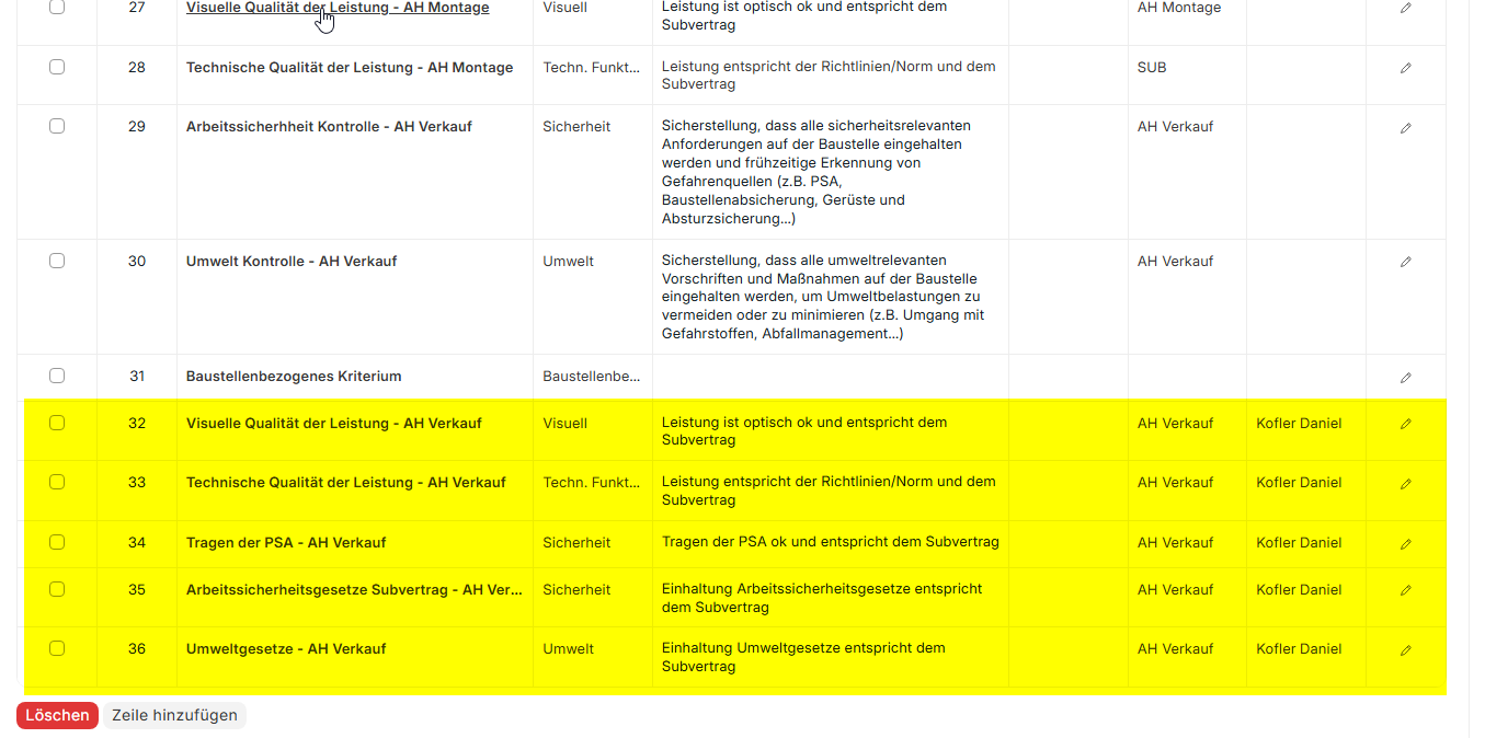 Der Projektleiter der Baustelle schaut sich die Punkte im Vorfeld an und löscht jene heraus, welche für diese Baustelle nicht gebraucht werden.