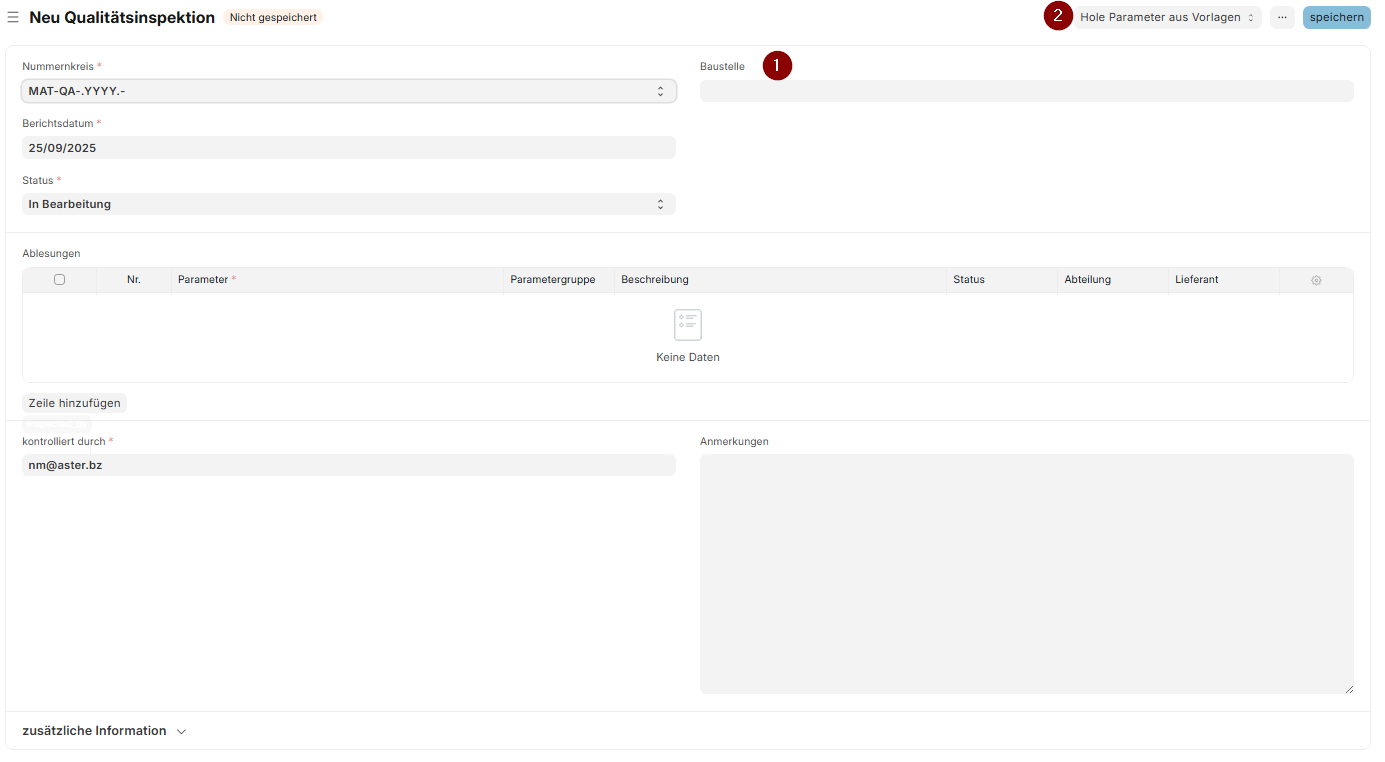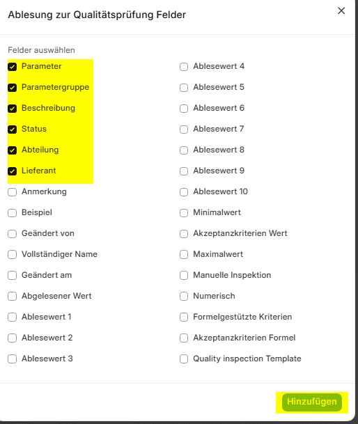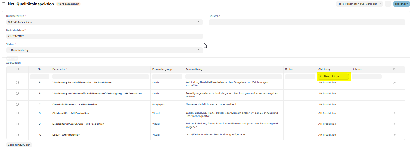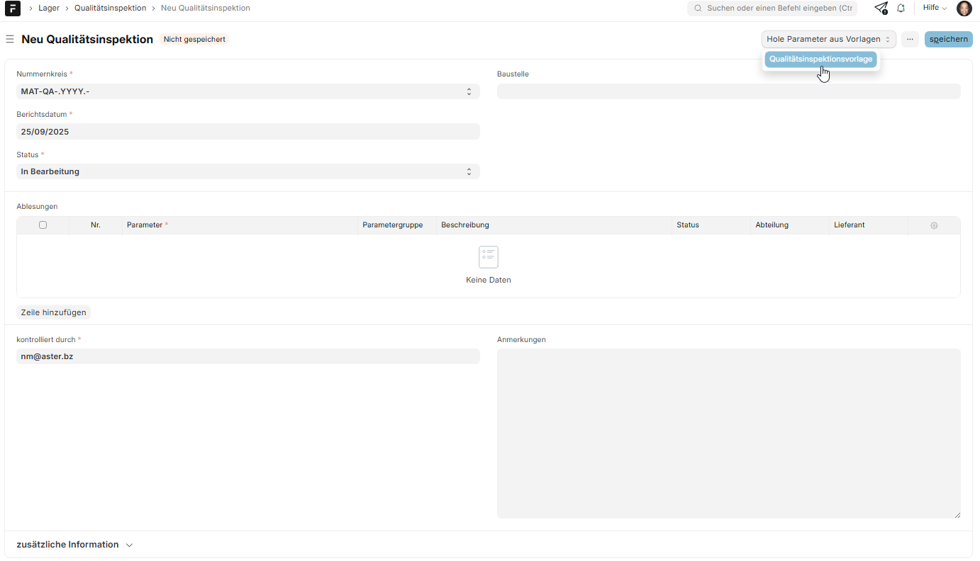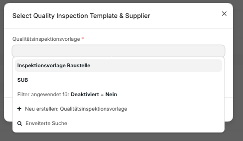 Du kannst dir hier 2 Qualitätsinspektionsvorlagen in die Tabelle vorne einspielen.