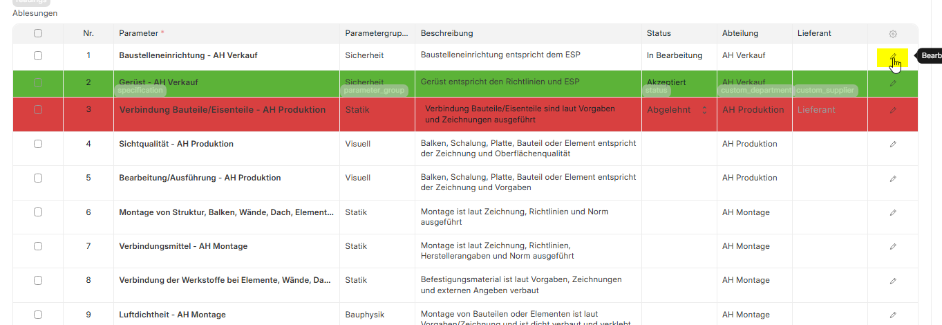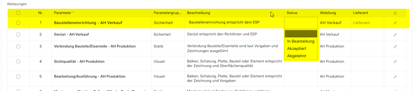 Um mit der Kontrolle zu starten kannst du dir deine Punkte nochmals mit deiner Abteilung filtern und die Punkte durchgehen. Pro Punkt gibt es 3 Statuse: