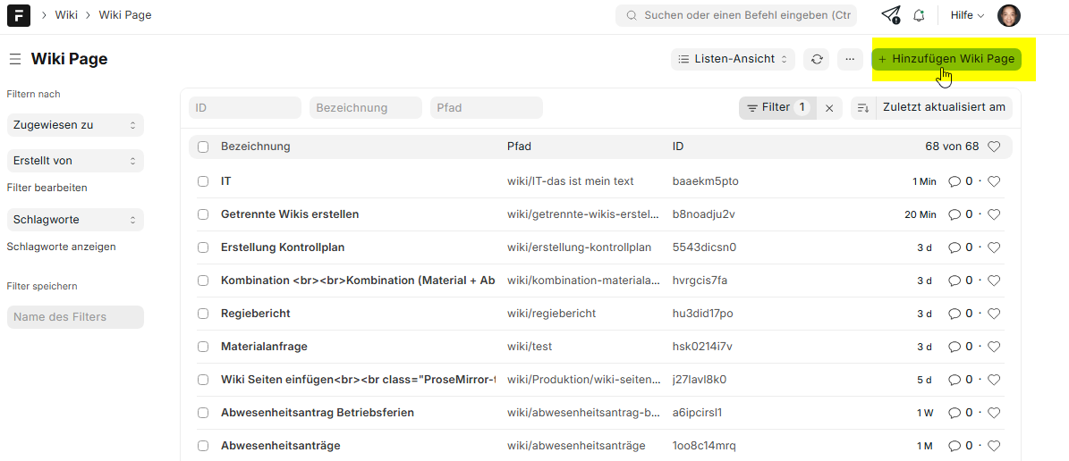 Du kannst über die Wiki Page Liste eine neue Page für dein Wiki erstellen: