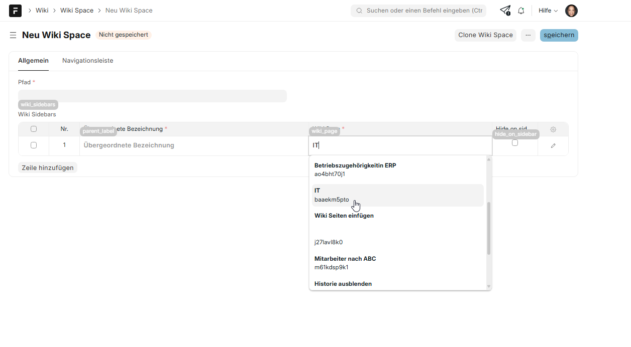 Klicke auf "Zeile hinzufügen" und schreibe nun die Bezeichnung deiner Wiki Page hier rein.