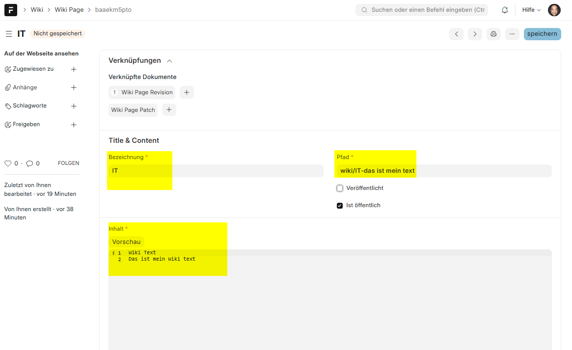 Als letzten Schritt hier fügst du dir im Feld "Inhalt" vorerst ZWEI Zeilen an Text ein, damit dir auch der Inhalt gespeichert wird. Dieser Inhalt muss im ersten Moment auch keinen Sinn ergeben, er dient vorerst nur dem Erstellen des neuen Wiki's.
