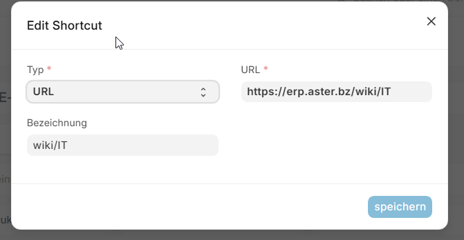 Wie du im Bild unten sehen kannst, gibst du als Typ URL ein, als URL den Link des neuen Wikis https://erp.aster.bz/wiki/IT.