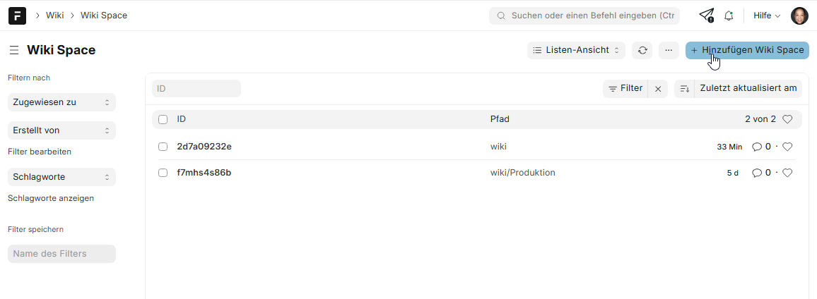 Klicke dafür auf "Hinzufügen Wiki Space".