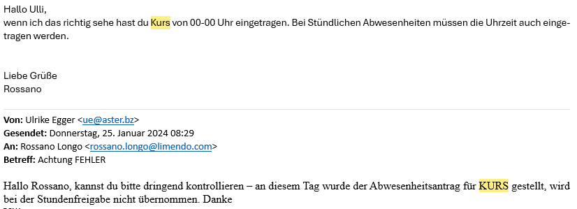 Hat ein Mitarbeiter einen ganzen Tag Kurs, dann muss in ERP die Abwesenheitsart Kurs & zusätzlich die Uhrzeit eingetragen werden.
