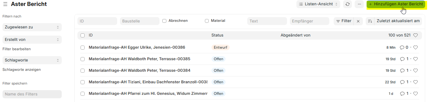 → Klicke auf „Hinzufügen Aster Bericht“.