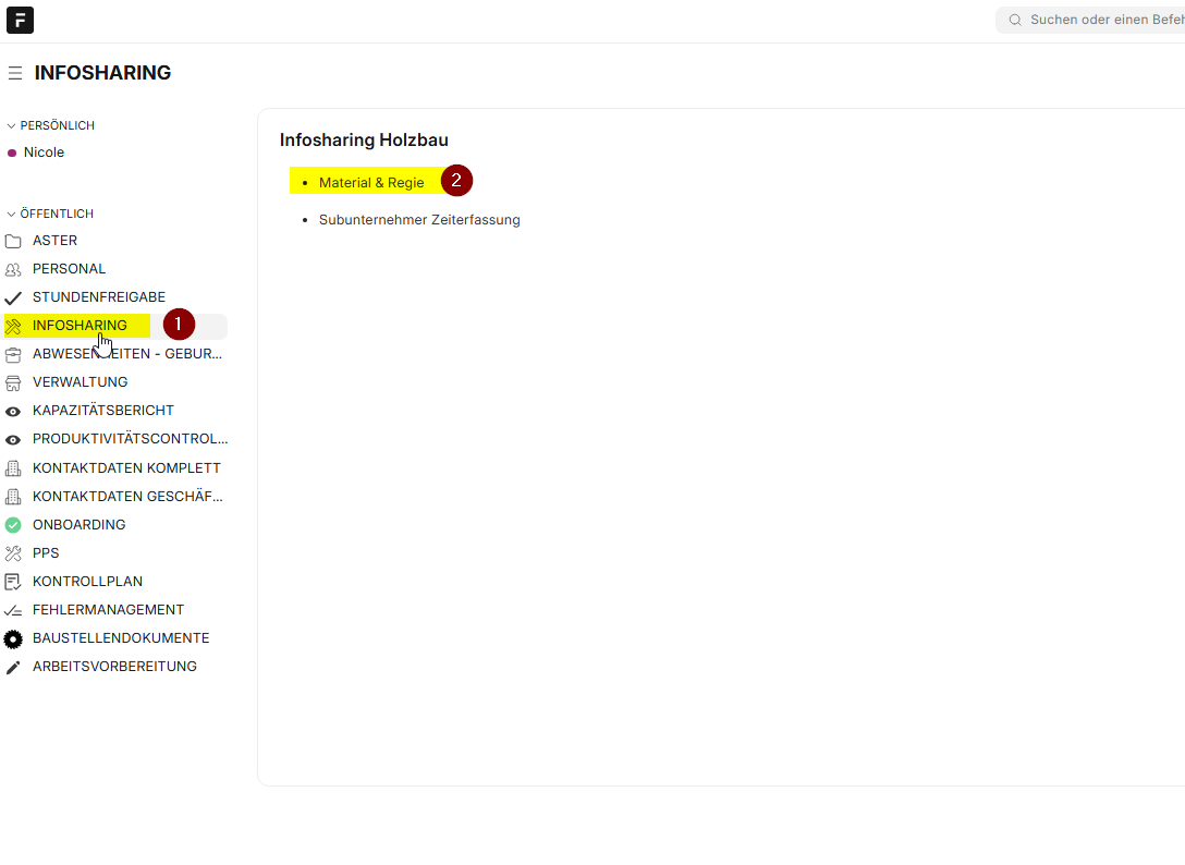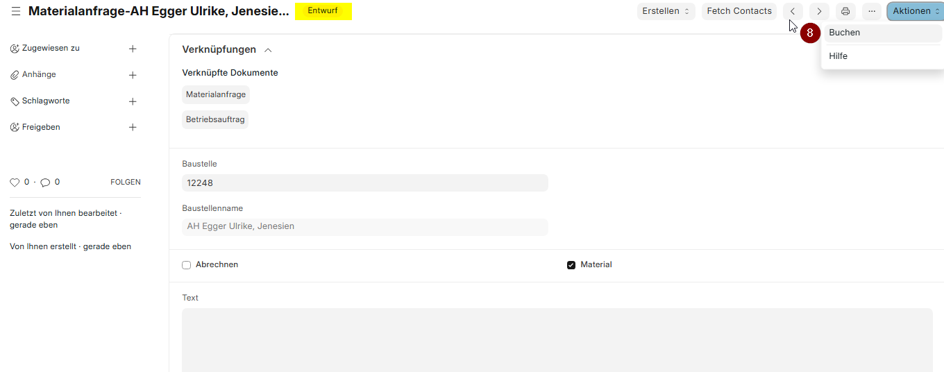 → Der Baustellenname wird danach automatisch im Feld darunter angezeigt.Material angeben