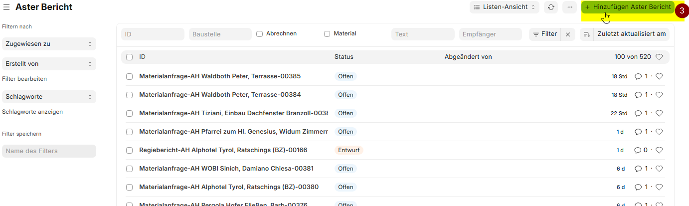 → Klicke auf „Hinzufügen Aster Bericht“.